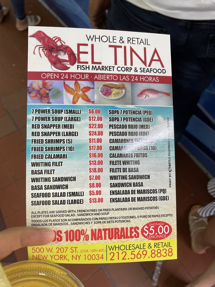 “ I absolutely love their seafood soup. Every time I'm in NY, I make a special stop to this El Tina Fish Market to enjoy their delicious food. This time, we had non-breaded shrimp with green plantains and seafood soup with a side of plantains and garlic. We tried their seafood salad as well, and it was good. Reminder to bring cash as they don't accept cards or any other forms of payment. Be patient when you come as street parking is limited and hard to find. Highly recommend if you’re in the area and enjoy seafood. ”